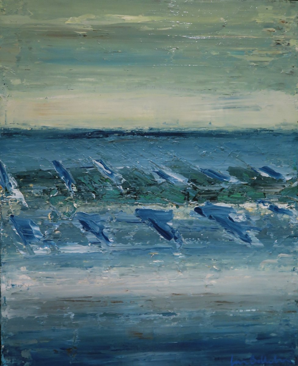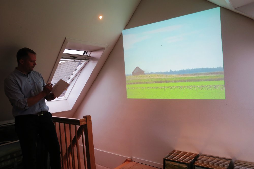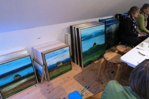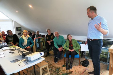 Lars fortalte om sine motivvalg langs vestkysten og marsken. Han viste hvordan han lavede skitsen i marken og han viste hvordan han lavede billedet derhjemme, ude i det fri hvor dampene fra oliemalingen ikke påvirkede ham .
