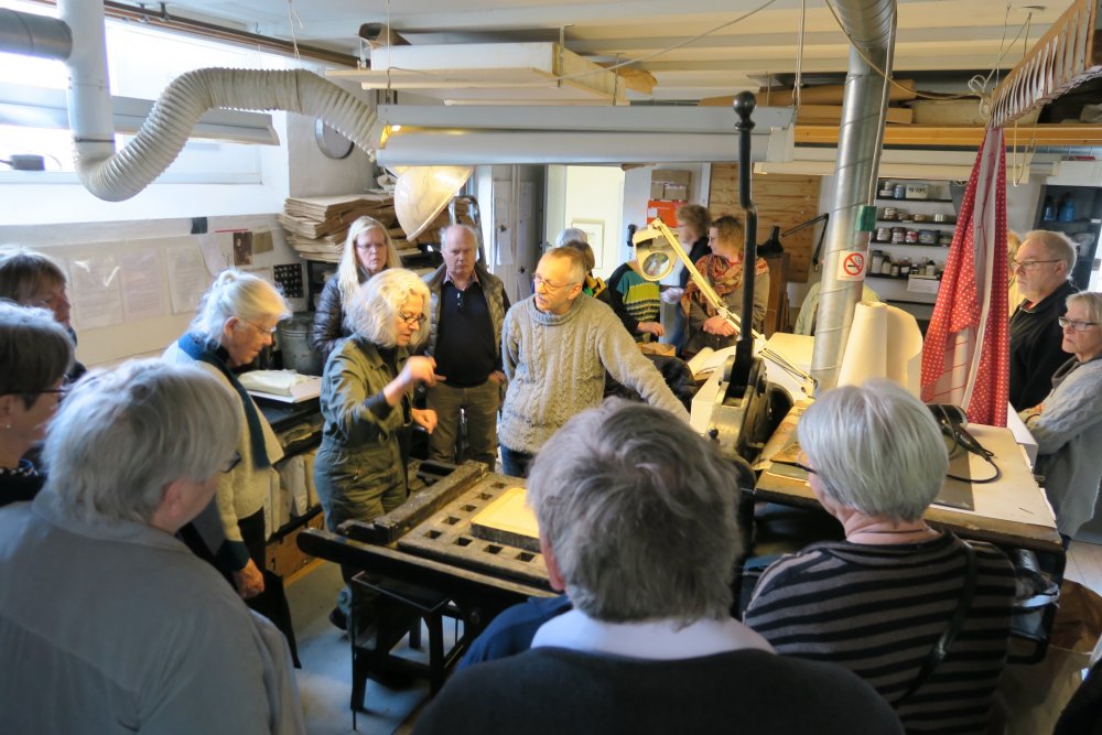 Fælleskørsel fra Rødding Centret kl. 9. Første besøgte vi Fyns Grafiske Værksted, Hans Jensens Stræde 18, Odense C, hvor vi fik en omvisning. Undervejs fik vi fremvist forskellige kunstværker og forklaret deres fremstillingsmetode. Nogle af maskinerne var bemandet. Her fik vi demonstreret forskellige arbejdsprocesser.
